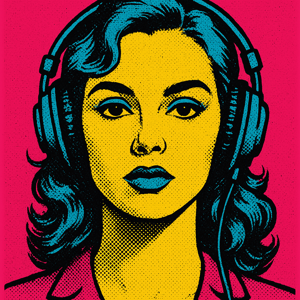 ポップアート風の女性ポートレート、アンディ・ウォーホル風の大胆な配色、ショッキングピンクとレモンイエローとシアン、ハーフトーンのドットパターン、ヘッドホン、正面構図、スクリーンプリントの質感、鮮烈でアーティスティック